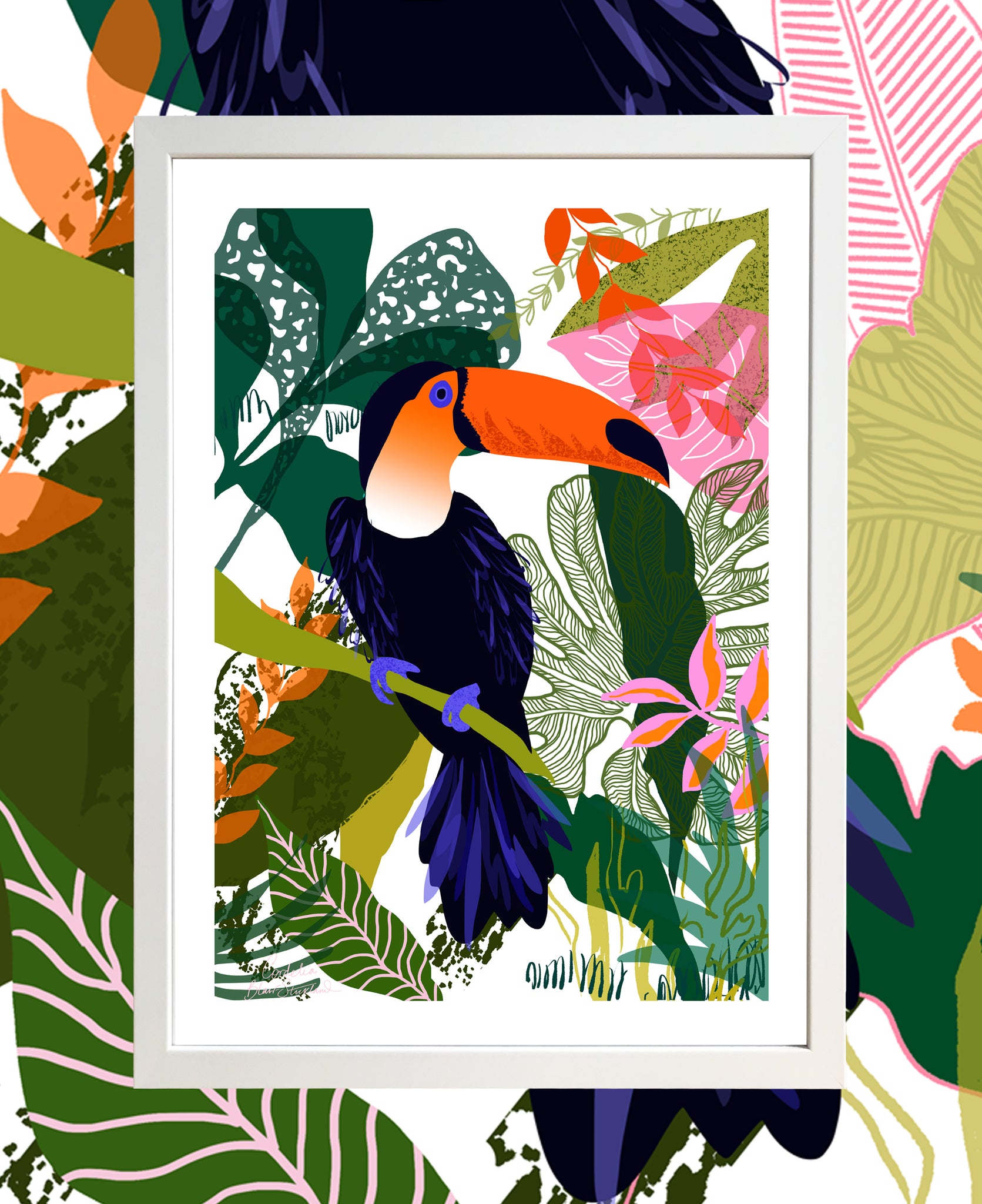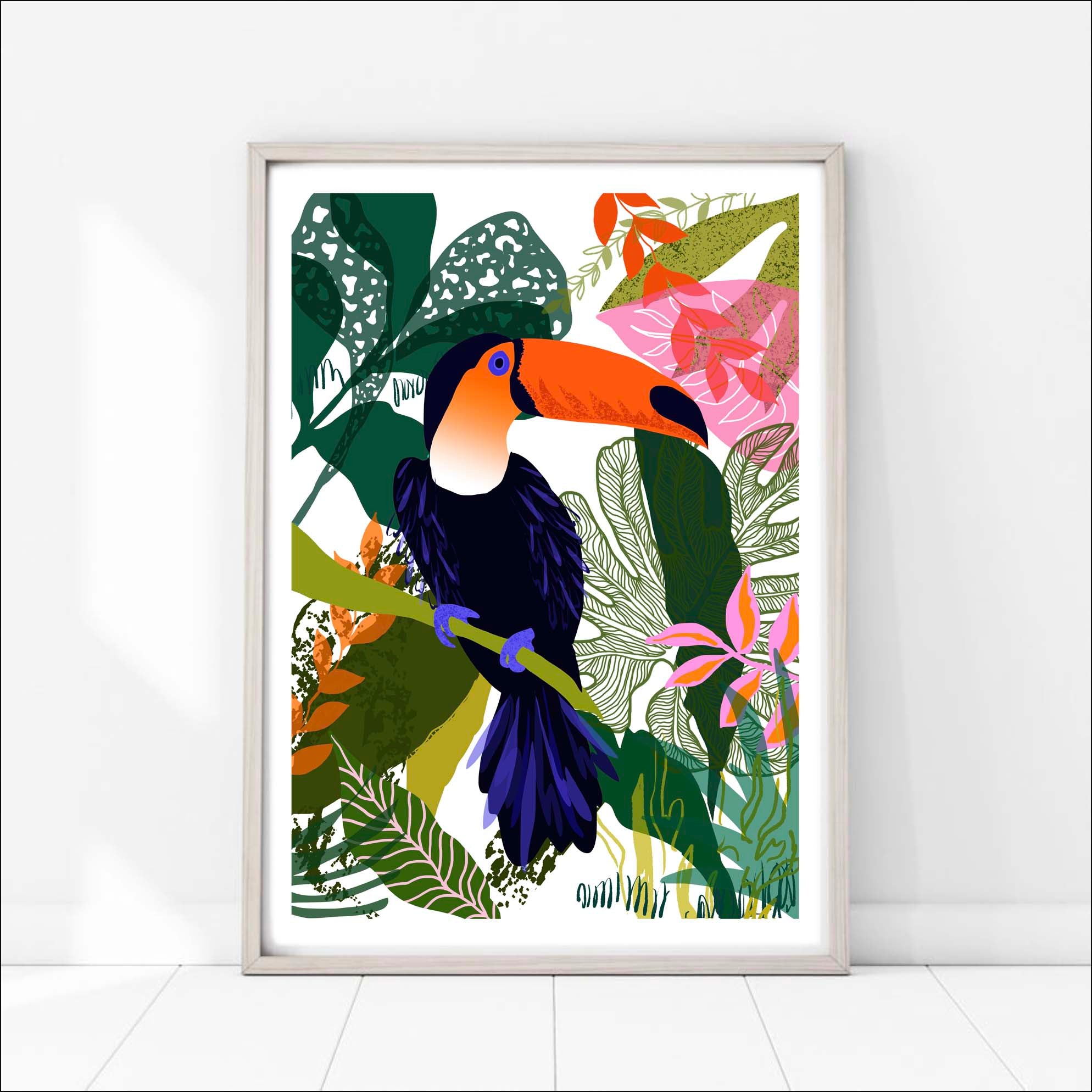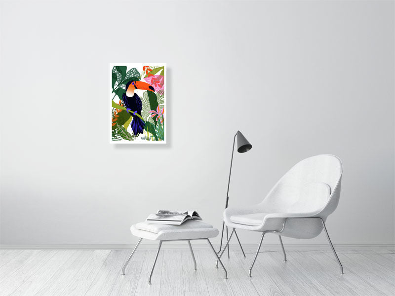 High quality Giclée art print depicting a colourful Toucan surrounded by the rich textures of the jungle.