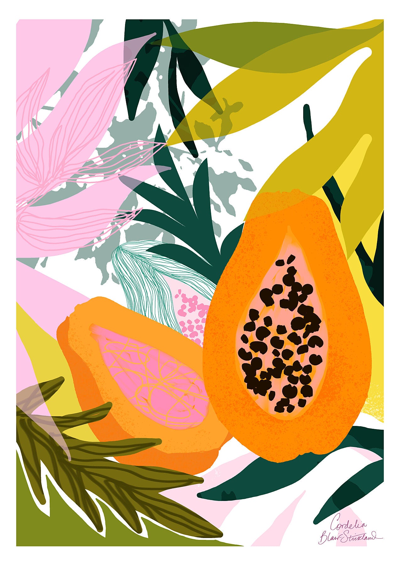 Beautiful fruit illustration print perfect for a feature wall in a kitchen or in a kids, children's nursery bedroom. Brightly coloured tropical papaya print bursting with textures and colours. High quality Giclée abstract art print, depicting colourful tropical papaya.