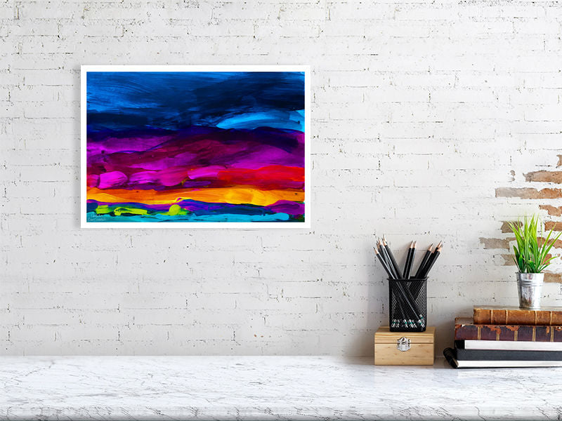 High quality Giclée art print depicting a vibrant abstract Scottish Landscape. The bright purple and pink mountains reflect the famous wild Scottish heather flowers that grow all over the highlands and compliment the warm oranges and rich blues.