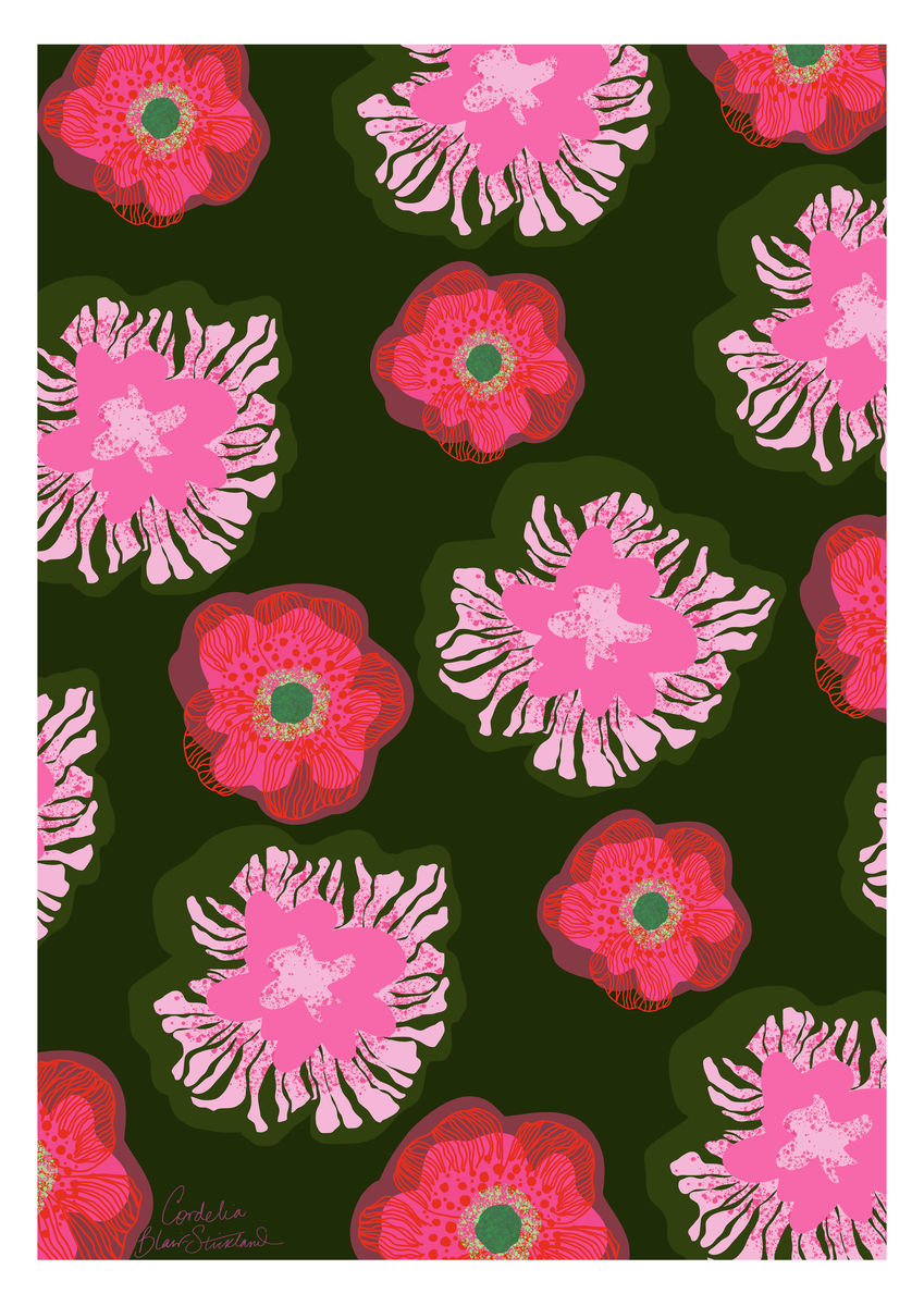 High quality Giclée art print, depicting vibrant pink flowers on a deep green background.