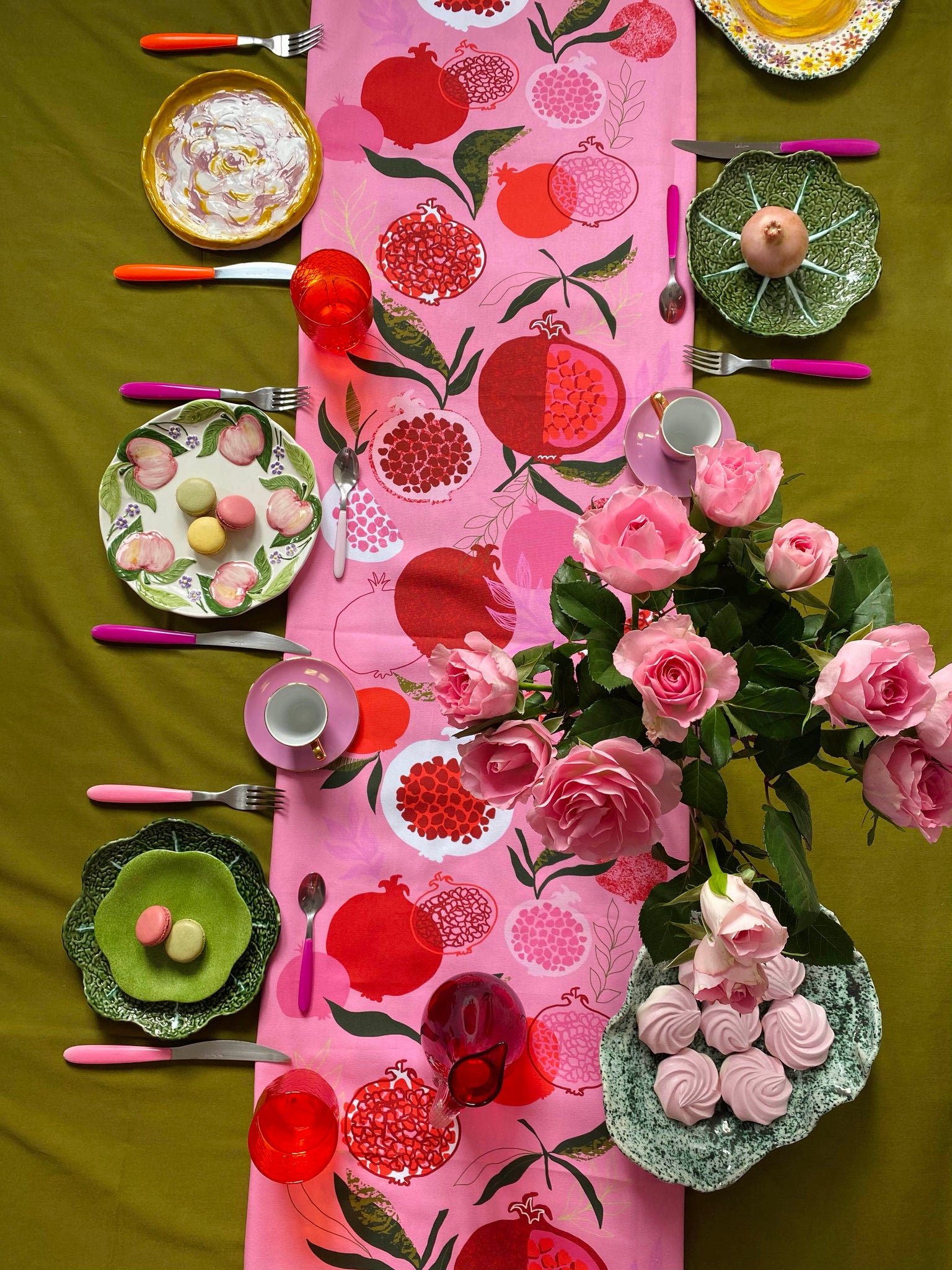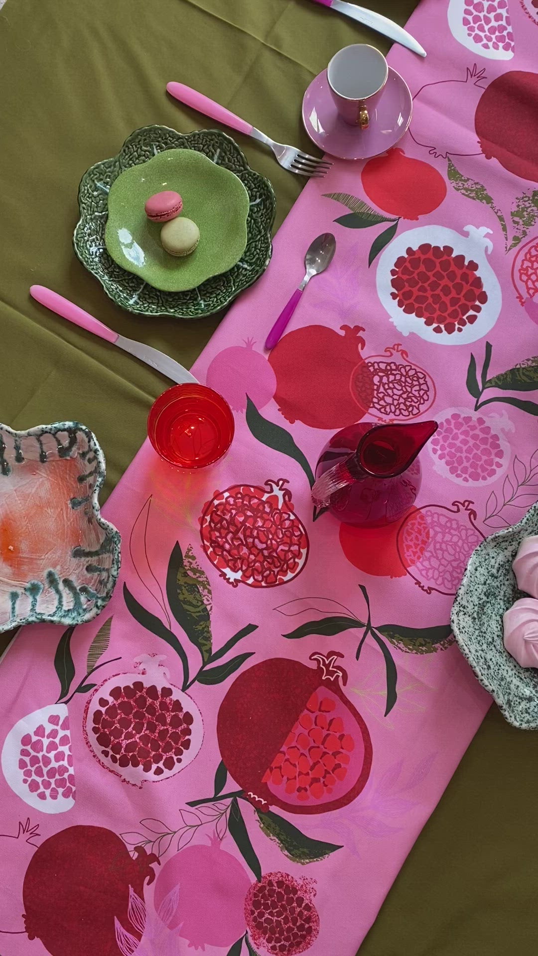 This beautiful fruity pink tablecloth is designed to add a joyful pop of colour to any table. This intricate pattern was hand drawn by me and features an array of luscious pomegranates in pinks, reds and deep sage green leaves perfectly offset against a pale pink background. This table linen would provide the perfect backdrop to host your dinner parties, brunches or or simply lay on the ground for a more relaxed picnic occasion.
